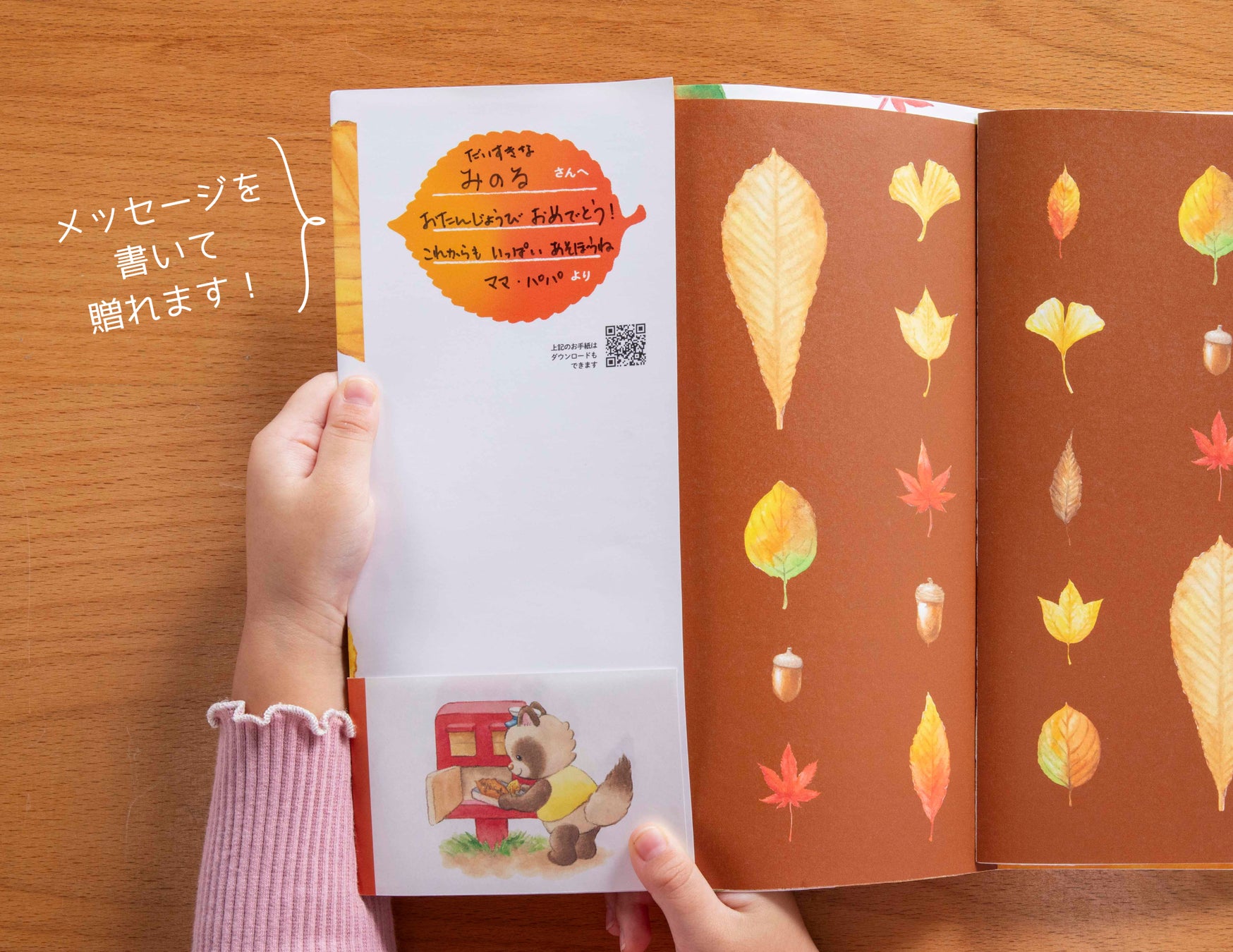 絵本のカバーには、プリントされた「葉っぱのお手紙」が。実際にメッセージを書いて、大切な人に本書を贈ることができます。お手紙は、同ページの二次元コードでダウンロードできます。巻末には絵本に登場した秋の葉っぱ図鑑も掲載。絵本を持って葉っぱを探しに行きたくなる一冊です。