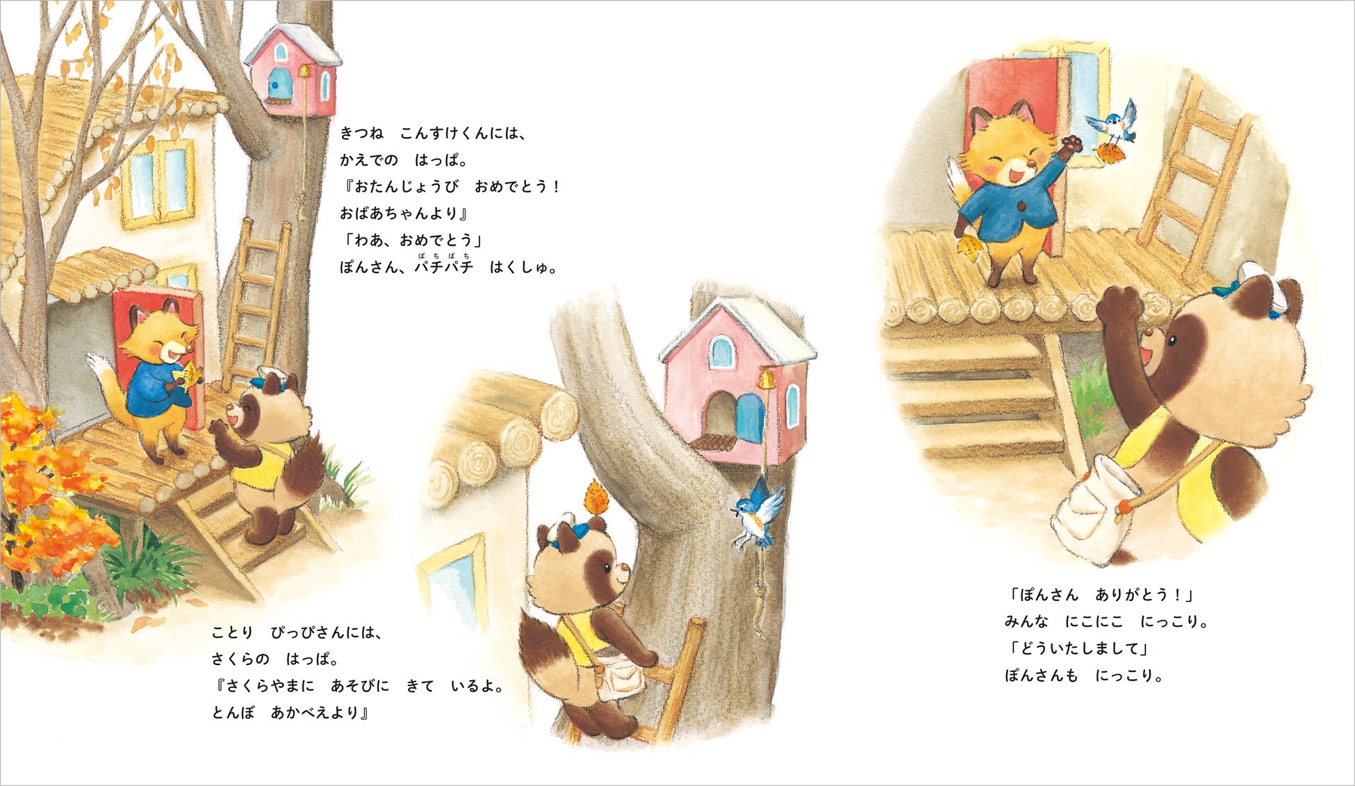 こんすけくんにはおばあちゃんからのお誕生日のお祝いメッセージ、ぴっぴさんにはあかべえさんからのお出かけ先からのお便りが。葉っぱのお手紙をもらった動物たちがみんな嬉しそうなので、ぽんさんもにっこり!