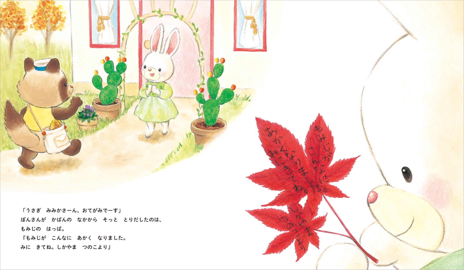 ぽんさんが最初に届けたのは、真っ赤なもみじのお手紙。しかやまさんから、「もみじを見に来てね。」というお誘いでした。