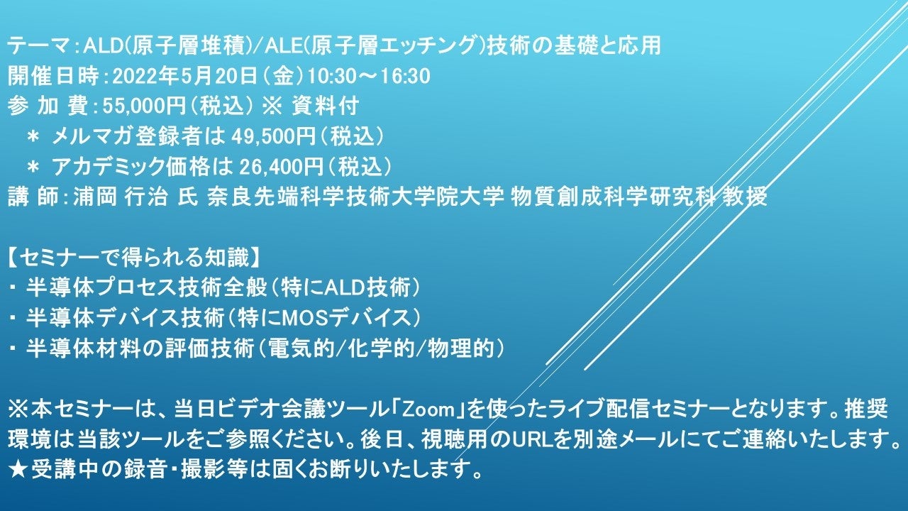 先端技術情報や市場情報を提供している(株)シーエムシー・リサーチ(千代田区神田錦町: https://cmcre.com/ )では、 各種材料・化学品などの市場動向・技術動向のセミナーや書籍発行を行っておりますが、 このたび「ALD(原子層堆積)/ALE(原子層エッチング)技術の基礎と応用」と題するセミナーを、 講師に浦岡 行治 氏 奈良先端科学技術大学院大学 物質創成科学研究科 教授)をお迎えし、2022年5月20日(金)10:30より、 ZOOMを利用したライブ配信で開催いたします。 受講料は、 一般:55,000円(税込)、 弊社メルマガ会員:49,500円(税込)、 アカデミック価格は26,400円(税込)となっております(資料付)。