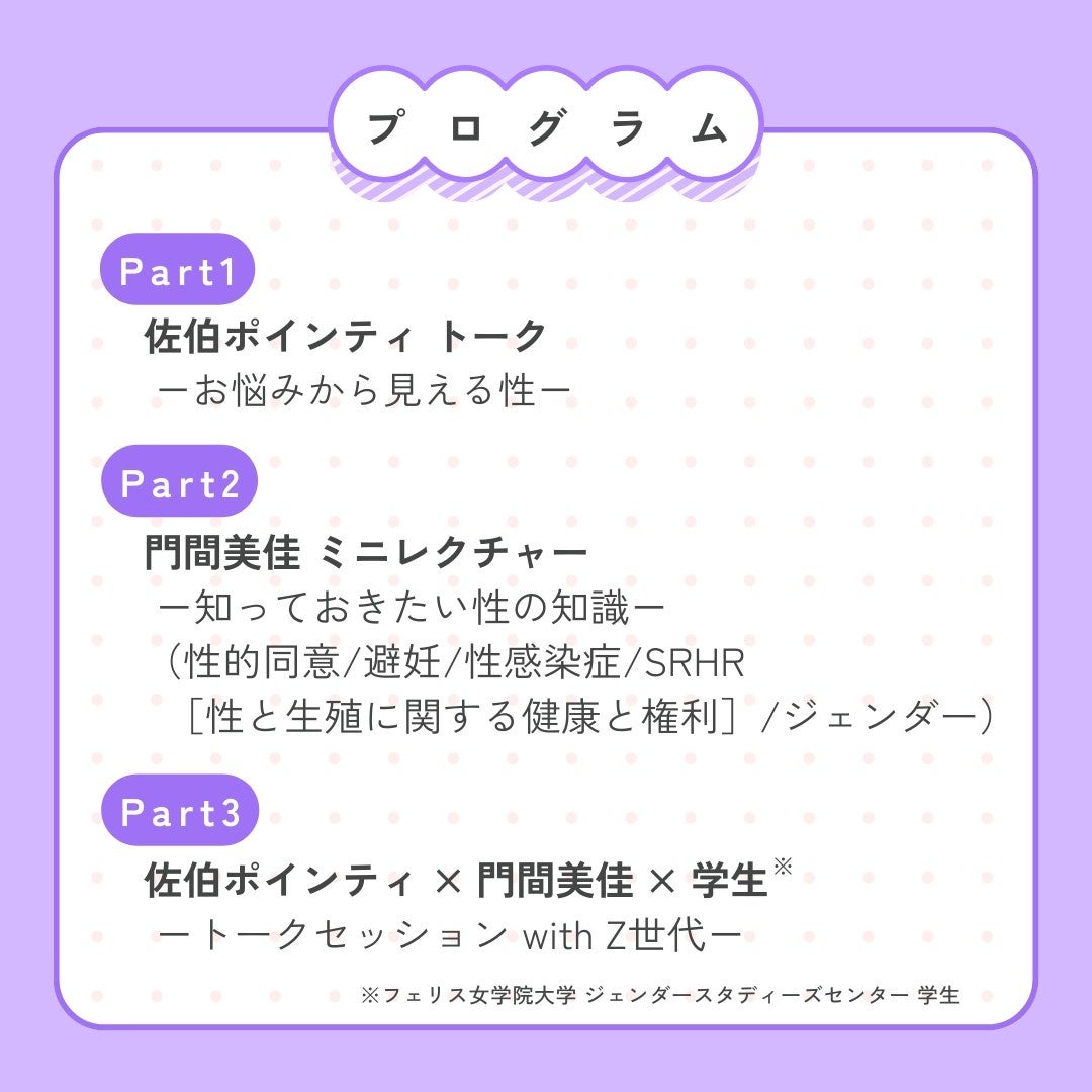 本イベントは主な対象を若年層とし、当事者世代のフェリス女学院大学の学生と企画。登録者数88 万人の人気YouTuber、佐伯ポインティさんと、ユースクリニックを併設している「藤沢女性のクリニックもんま」院長の門間美佳医師と一緒に、SRHR(性と生殖に関する健康と権利)や性的同意・避妊と性感染症など、普段は話しづらい「性」について楽しく学びます。