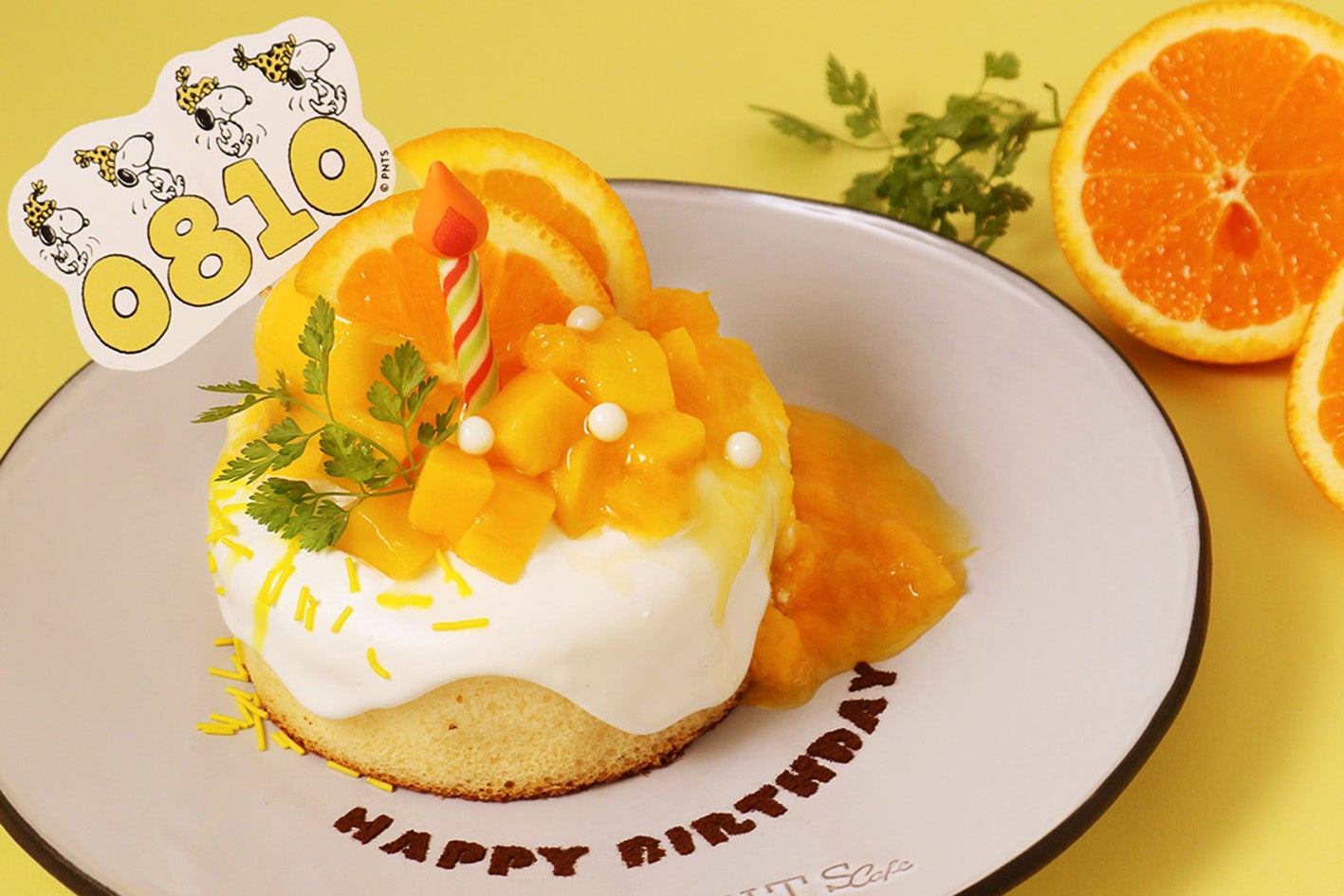 マンゴーやオレンジといった、夏らしい色鮮やかなフルーツをちりばめ、スヌーピーの誕生日である8月10日をモチーフにしたピックとキャンドルでデコレーションしました。