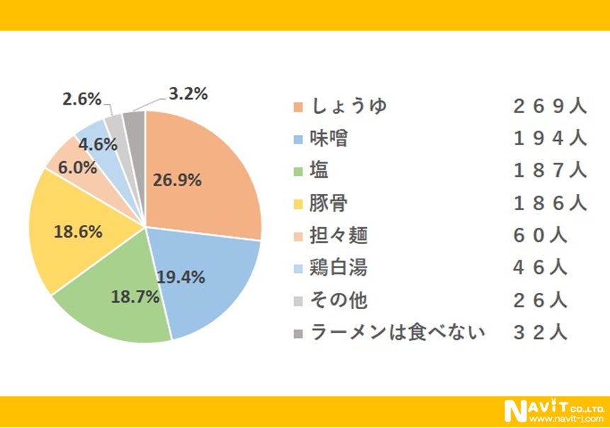 最も好きな味付けのトップは「しょうゆ」で269人。以下「味噌」(194人)、「塩」(187人)、「豚骨」(186人)などとなっています。