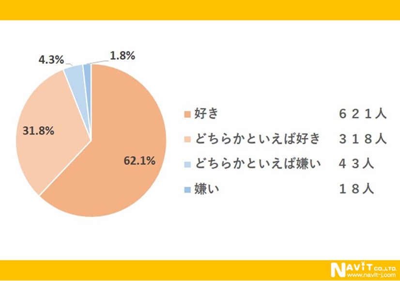 ラーメンが「好き」な人は621人、「どちらかといえば好き」な人は318人。合わせると938人で、ラーメンは今では国民食とも言える存在になっていることがわかります。