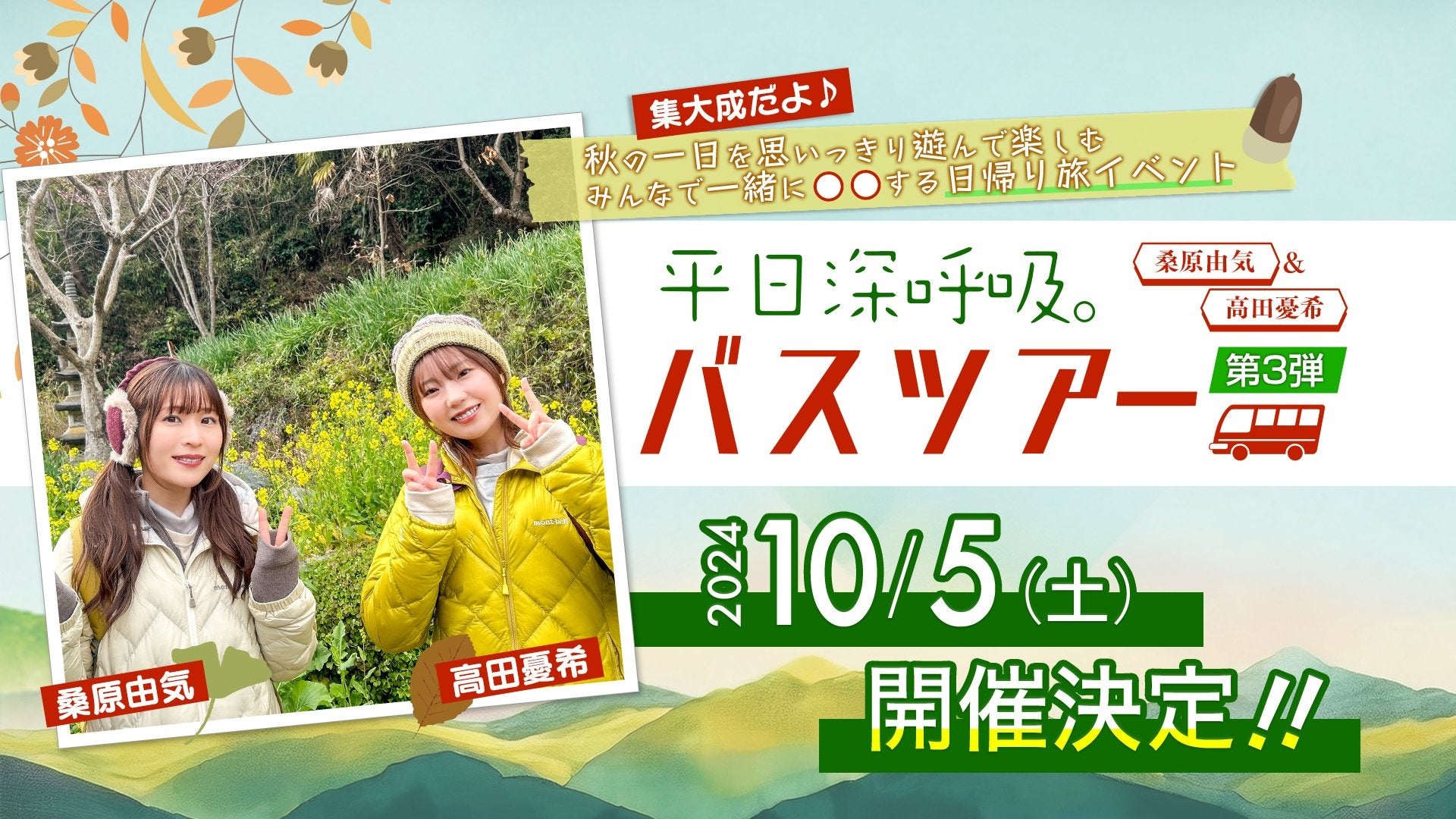 本ツアーでは、番組出演者の人気声優・桑原由気、高田憂希とツアー参加者が自然や絶景をたっぷりと味わう、本番組ならではの時間や過ごし方を共有。第1弾・第2弾で大好評だった参加者限定グッズのプレゼント、出演者と参加者の3ショット撮影会、車中のお楽しみ企画などは引き続き実施し、今回も行先や企画内容を伏せた「ミステリーツアー」のスタイルで進行!どういったルートなのか、どんなサプライズが待っているのかは当日までのお楽しみ!今回は「集大成」と銘打ち、これまでのバスツアー参加者もちろん、初参加の方にも楽しめる企画を増量。さらに『平日深呼吸。』最新エピソードの最速上映の実施が決定!ツアーも番組も楽しめる、秋の特別な1日をお届けします。