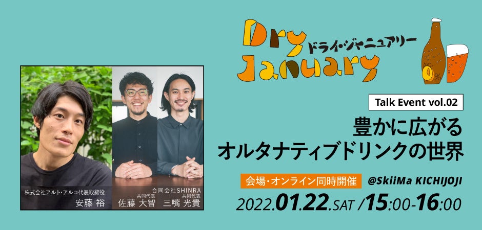 第二弾は「豊かに広がるオルタナティブドリンクの世界」をテーマに、ノンアルコール専門インポーター アルト・アルコ代表安藤裕さんとノンアルコールドリンク「SHINRA」共同代表の三嘴光貴さん、佐藤大智さんに鼎談いただきます。