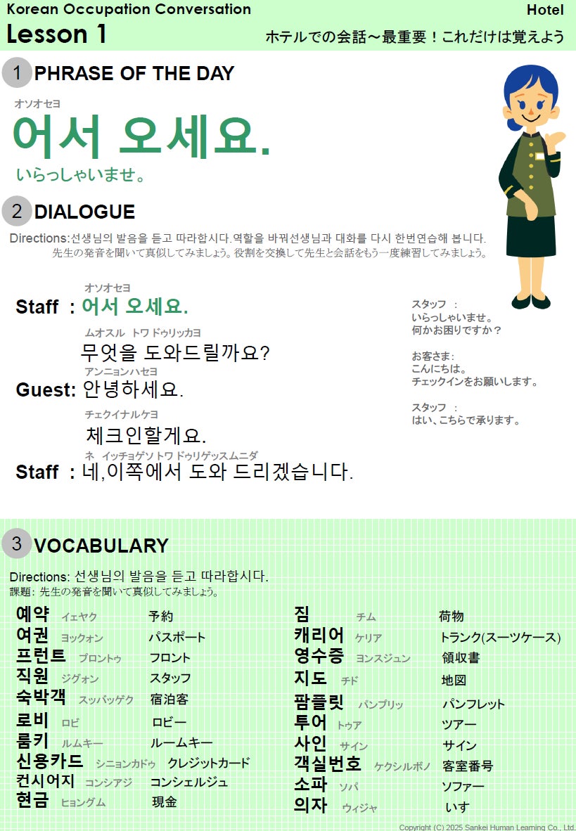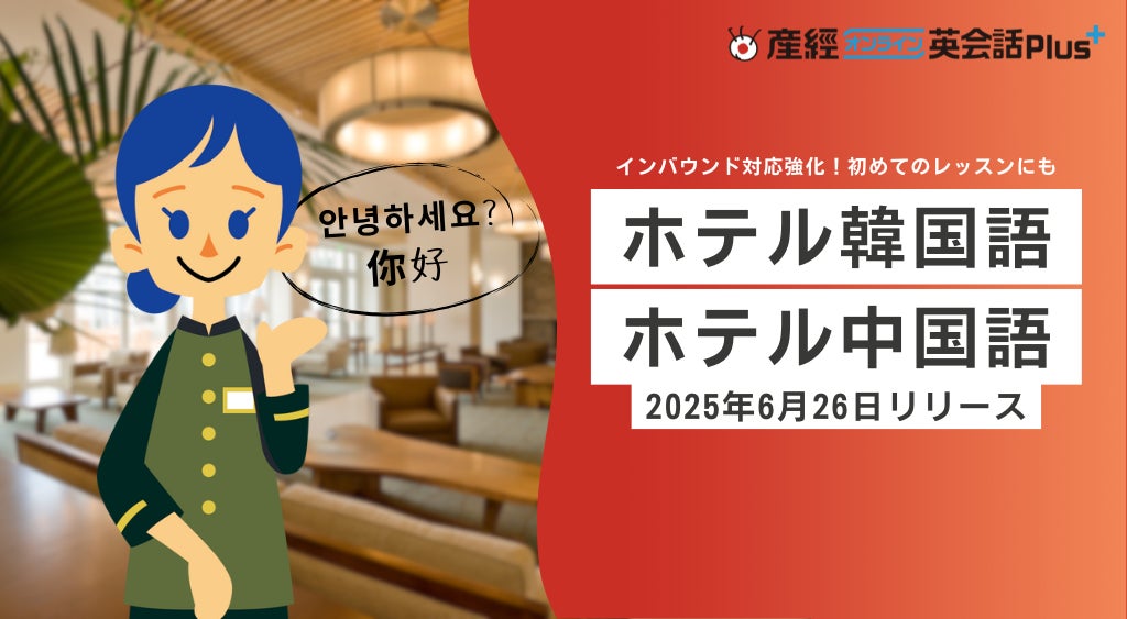 産経ヒューマンラーニング株式会社(本社:東京都新宿区、代表取締役:中谷友紀、以下「当社」)は、 2025年6月26日より、オンライン英会話サービス「産経オンライン英会話Plus」において、日本を訪れる外国人に日々対応しているホテルで働く方向けに、韓国語・中国語ですぐに使えるキーフレーズと必須単語が学べる「ホテル韓国語」「ホテル中国語」テキスト各5レッスンをリリースします。