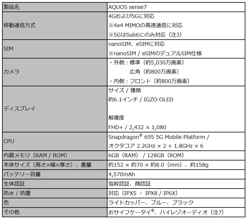 このほか、防水(IPX5・IPX8)・防塵(IP6X)(注6)、コロナ禍に最適な指紋およびマスクの着用に対応した顔の生体認証、おサイフケータイ(R)やハイレゾオーディオ(注7)に加えて、nanoSIMとeSIMのデュアルSIMにも対応するなど、便利な機能を多数搭載しています。