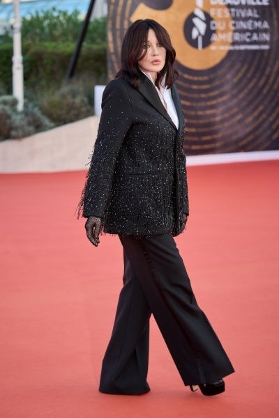 イザベル・アジャーニは、刺繍が施されたブラックのウールとシルクのジャケットのオートクチュールに、ホワイトのコットンシャツ、ブラックのウールのパンツにシューズを合わせました。