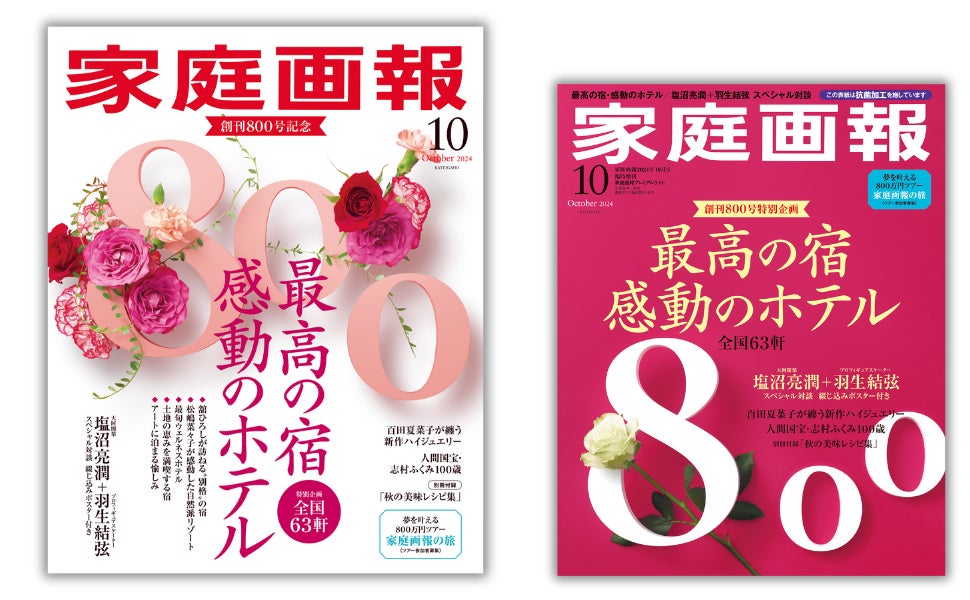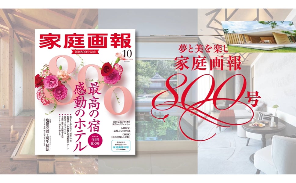 『家庭画報10月号』(8月30日発売)第一特集は、特別企画「最高の宿、感動のホテル」。世界からも高評価を受けている、日本の宿とホテルを、編集部が4つのキーワード「ウェルネス」「大人の冒険」「アート」「土地の恵み」で厳選し、今行きたい、全国63軒をご紹介。また、塩沼亮潤大阿闍梨と羽生結弦さんの「"生きる”意味」をテーマにした特別対談など、創刊800号にふさわしい企画満載でお届けします。この度、創刊800号『家庭画報10月号』の魅力をわかりやすく伝える30秒のTVCMを制作しました。ぜひ、ご注目ください。
