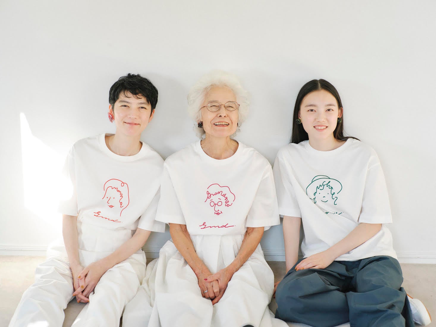 “Grandma”“Mama”“Daughter”を、それぞれポップで愛らしい線画で表現したロゴTシャツ。