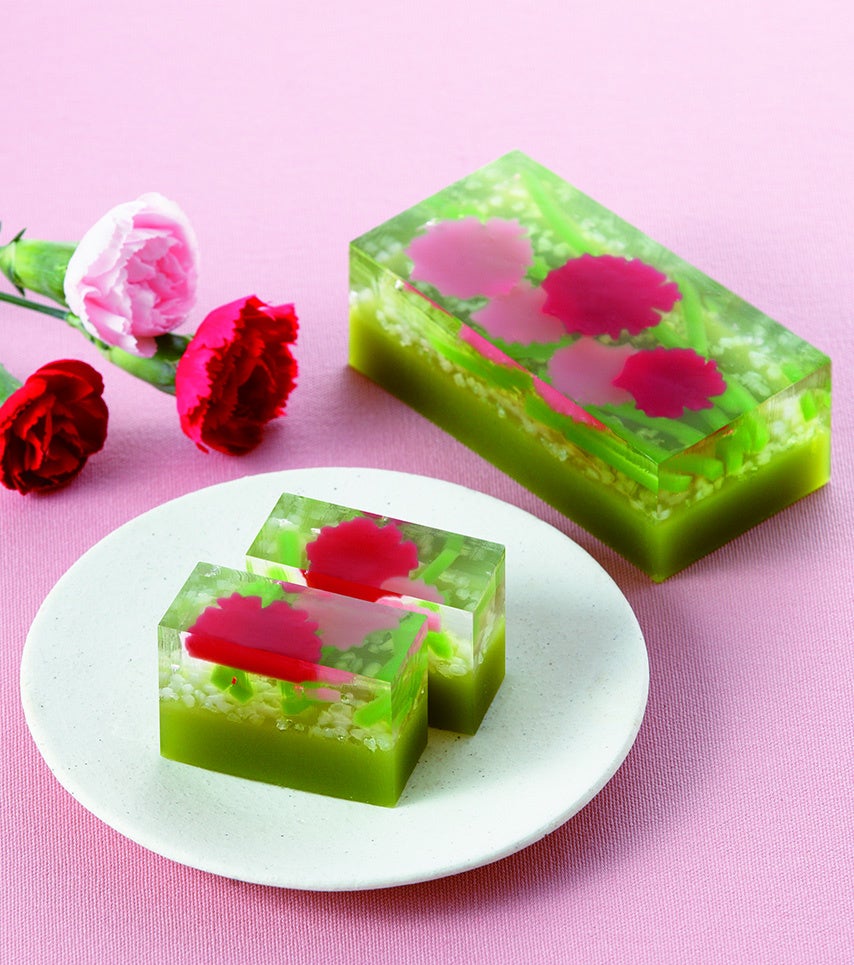 透き通った錦玉羹に、羊羹で作った“食べられるカーネーション”が美しく浮かぶ棹菓子。