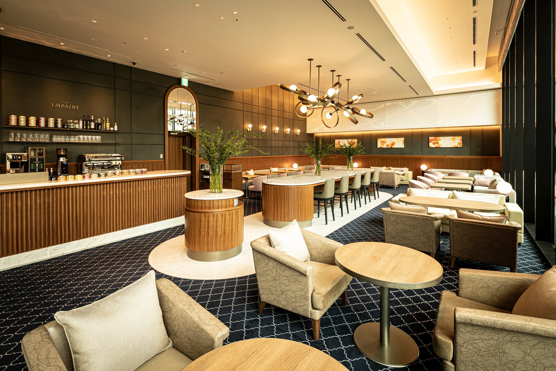 都ホテル 博多3階ロビーに併設されたカフェラウンジです。自然光をいっぱいに取り入れる大きな窓と、取り囲むように植えられた植栽の緑が落ち着きとくつろぎを演出します。中でも、季節ごとにテーマが変わるアフタヌーンティーは、毎回パティシエが試作を重ねて作り上げており、CAFÉ EMPATHYを代表するメニューとなっています。