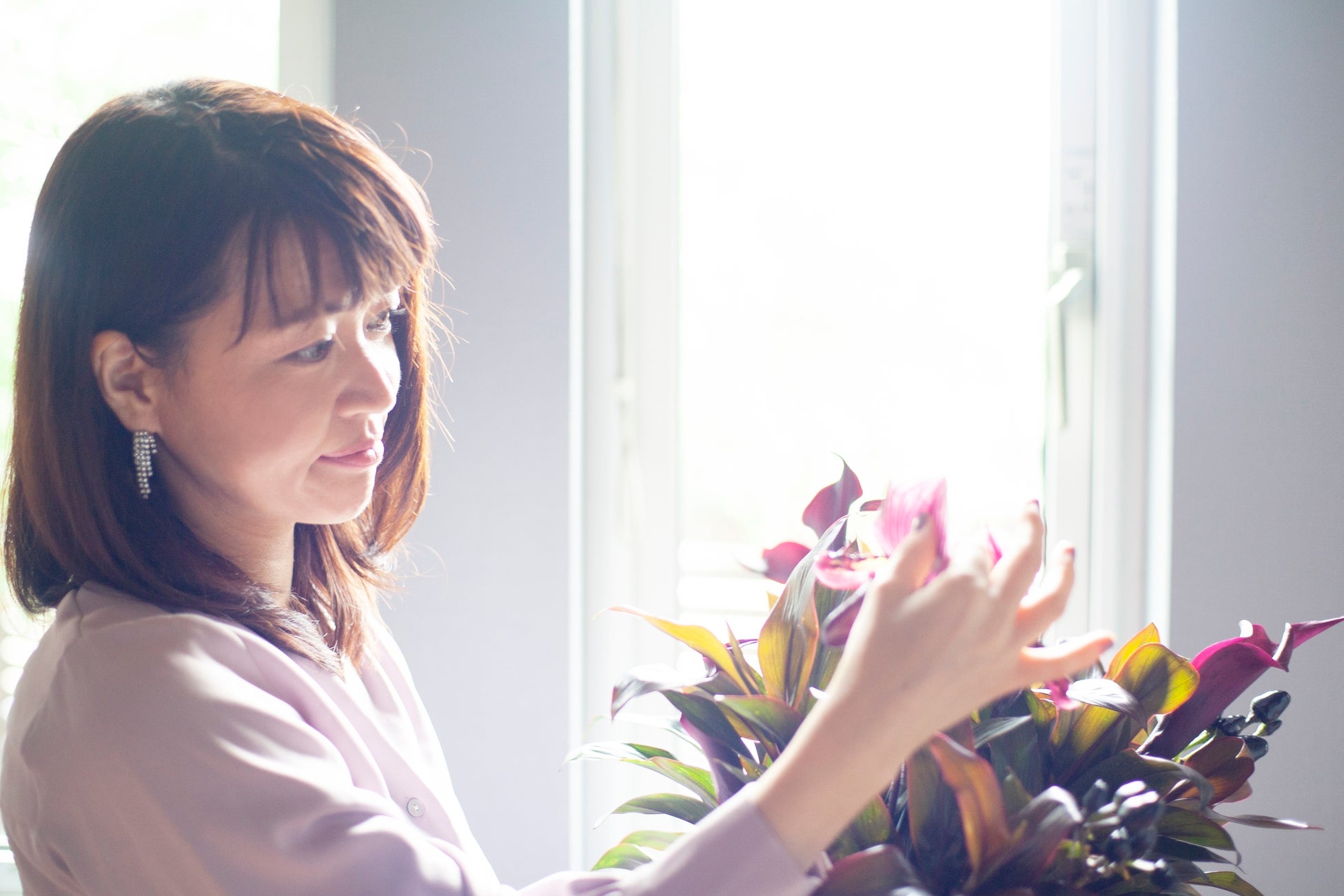 フラワースタイリスト。Atelier apis(アトリエアピス)主宰。華道、茶道に親しみ、フランス、イギリスで花と紅茶、テーブルスタイリングを学び、㈱日比谷花壇に勤務。平成13年よりフラワースクールでの講師を務めつつ、花とお茶の新商品企画開発、ブライダル装花、空間スタイリング等を行う。平成30年にAtelier apisを設立し「日々の暮らしに花とお茶を楽しむ時間」を提案している。今年3月に開催されたアクロス福岡開館30周年企画「匠の饗宴~30人の女性たち~」では、全国各地の女性匠の一人として、会場装花や作品の展示、フラワーレッスン等を担当。