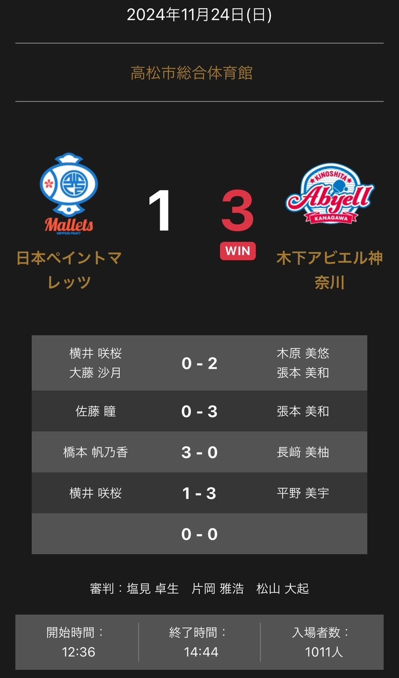 ノジマTリーグ 2024-2025シーズン 公式戦 11月24日開催 日本ペイントマレッツvs木下アビエル神奈川試合結果