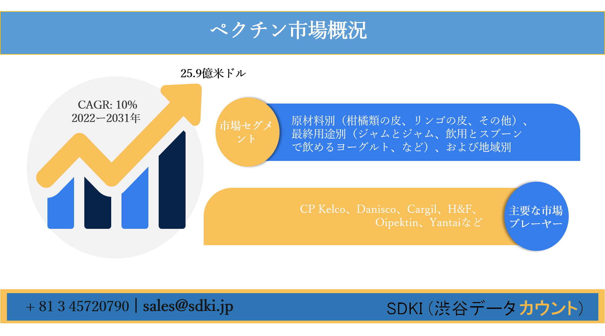 SDKI Inc.は、「ペクチン市場ー予測2022ー2031年」新レポートを 2022年01月28日に発刊しました。この調査には、ペクチン市場の成長に必要な統計的および分析的アプローチが含まれています。レポートで提供される主要な産業の洞察は、市場の既存のシナリオに関する読者に市場の概要についてのより良いアイデアを提供します。さらに、レポートには、市場の成長に関連する現在および将来の市場動向に関する詳細な議論が含まれています。