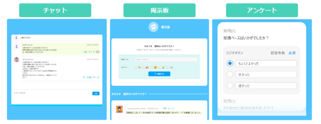 『sakidori』は、受講者同士や人事・上司と連絡が取れるチャット機能や、テーマに沿ってやりとりできる掲示板機能、受講者の考えを知るためのアンケート機能など、コミュニケーション機能が充実しています。共感・競争によって受講者の自発的な学習意欲を引き出し、他者の視点を学ぶことで成長促進にもつながります。