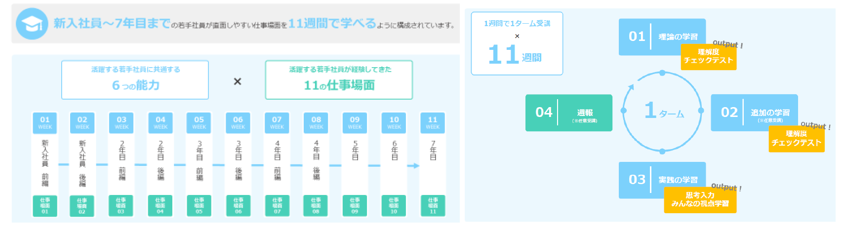 受講者は受講期間11週間で、1週間ごとに設定された「仕事場面」(実際に直面し得る仕事上の課題を再現した実践学習)に沿って毎週学習を進めます。「仕事場面」は成長のカギとなる20代で習得すべき能力や経験を想定し設定しています。