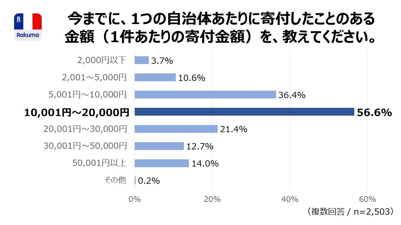 ふるさと納税の利用者2,503人に「今までに、1つの自治体あたりに寄付したことのある金額(1件あたりの寄付金額)」(複数回答)について質問したところ、10,001円~20,000円の金額帯が最多で(56.6%)、次いで、5,001円~10,000円(36.4%)の金額帯が多い結果となりました。