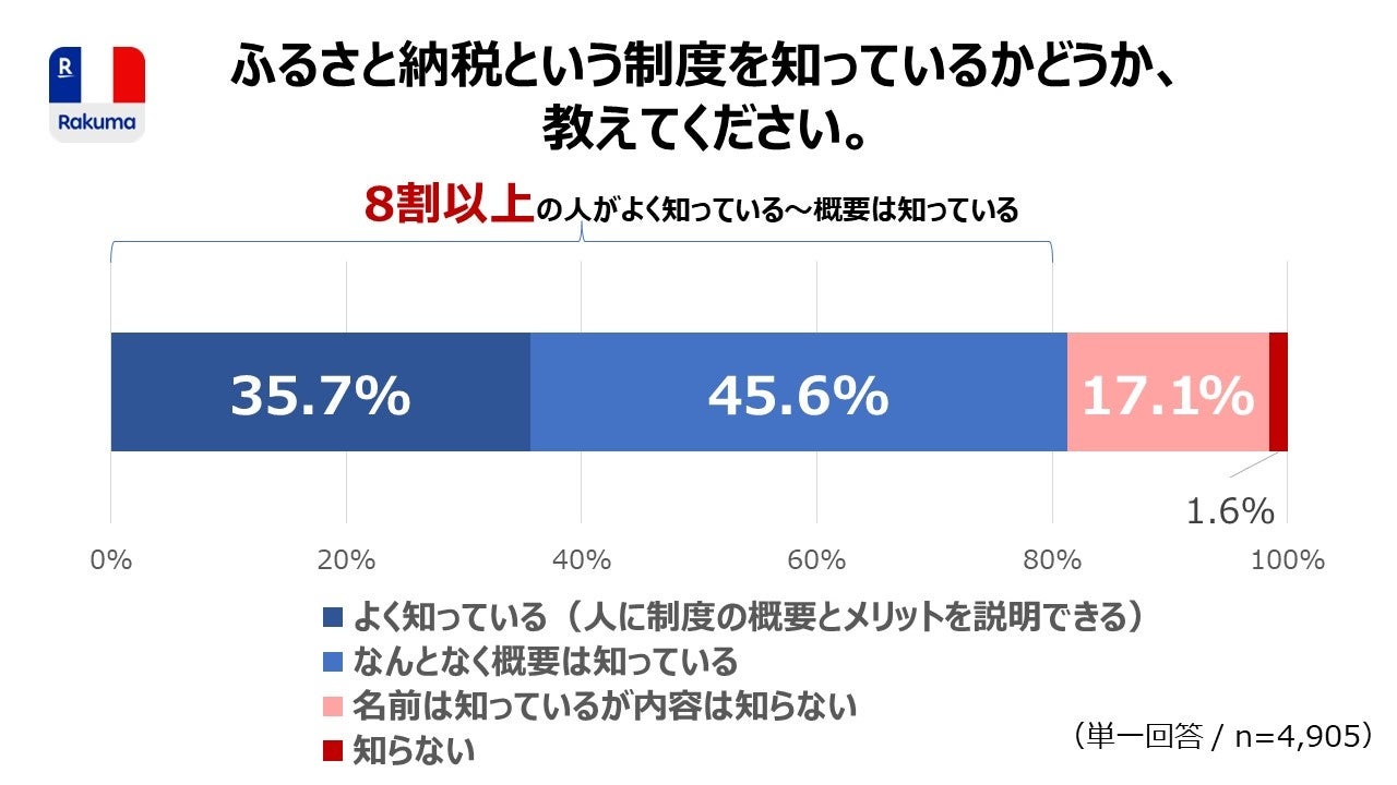 「ふるさと納税という制度を知っているか」と質問したところ、「なんとなく概要は知っている」(45.6%)と答えたユーザーが最も多く、次いで「よく知っている(人に制度の概要とメリットを説明できる)」(35.7%)となりました。本結果においては、8割以上(81.3%)の回答者にふるさと納税が認知されていることがわかりました。