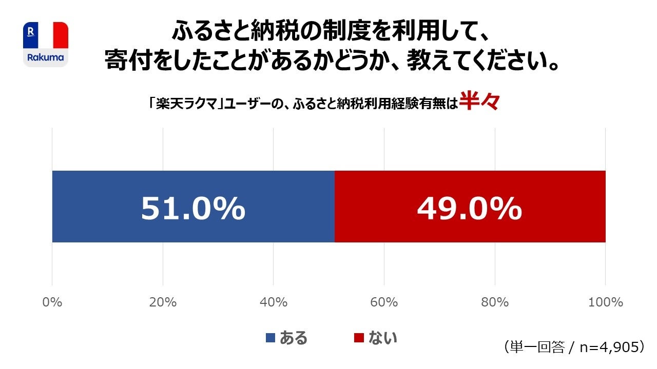 「ふるさと納税の制度を利用した寄付の経験有無」について質問したところ、「ある」が51.0%、「ない」が49.0%とほぼ半々に分かれる結果となりました。