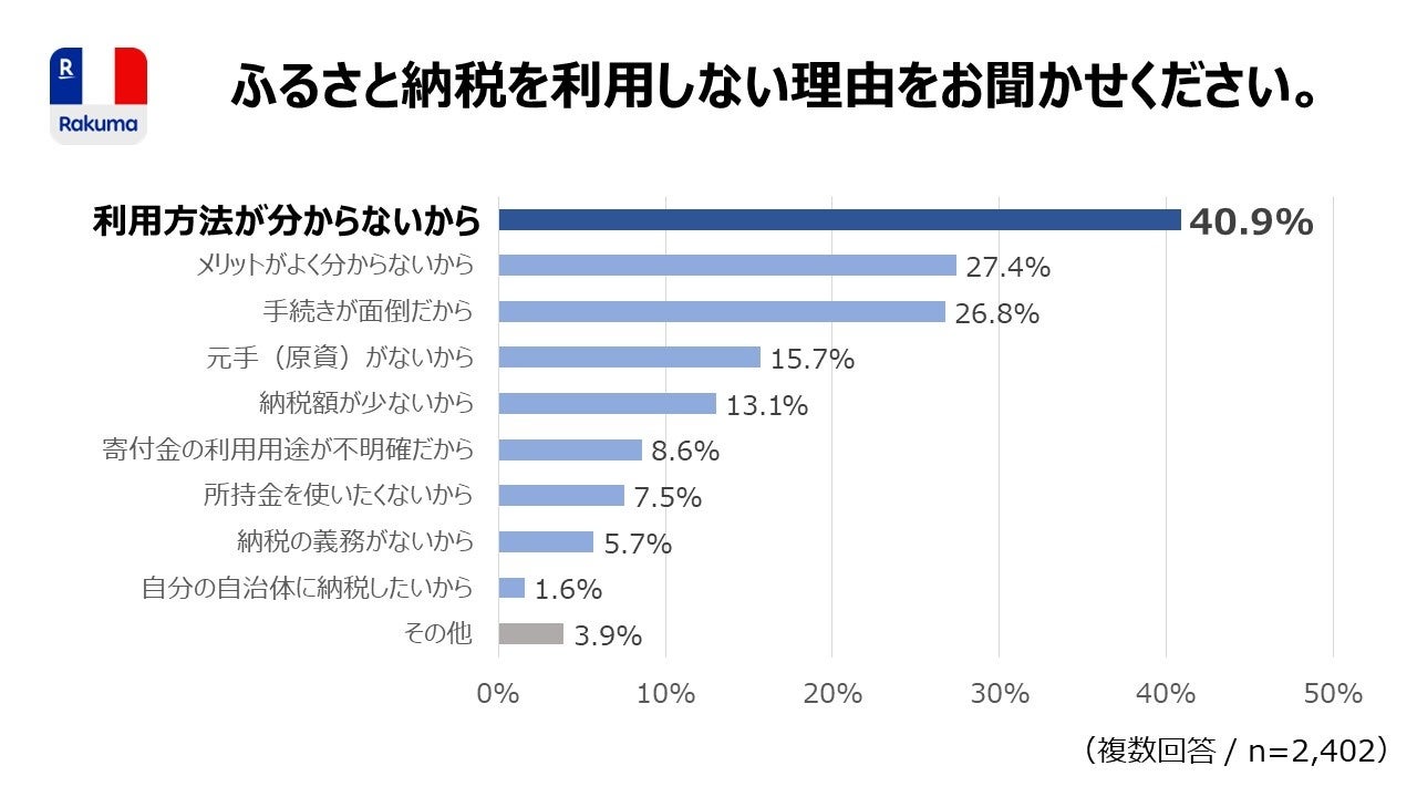 ふるさと納税を利用したことのない2,402人に「ふるさと納税を利用しない理由」(複数回答)について質問したところ、「利用方法が分からないから」(40.9%)が最も多く、次いで「メリットがよく分からないから」(27.4%)、「手続きが面倒だから」(26.8%)という回答が続きました。