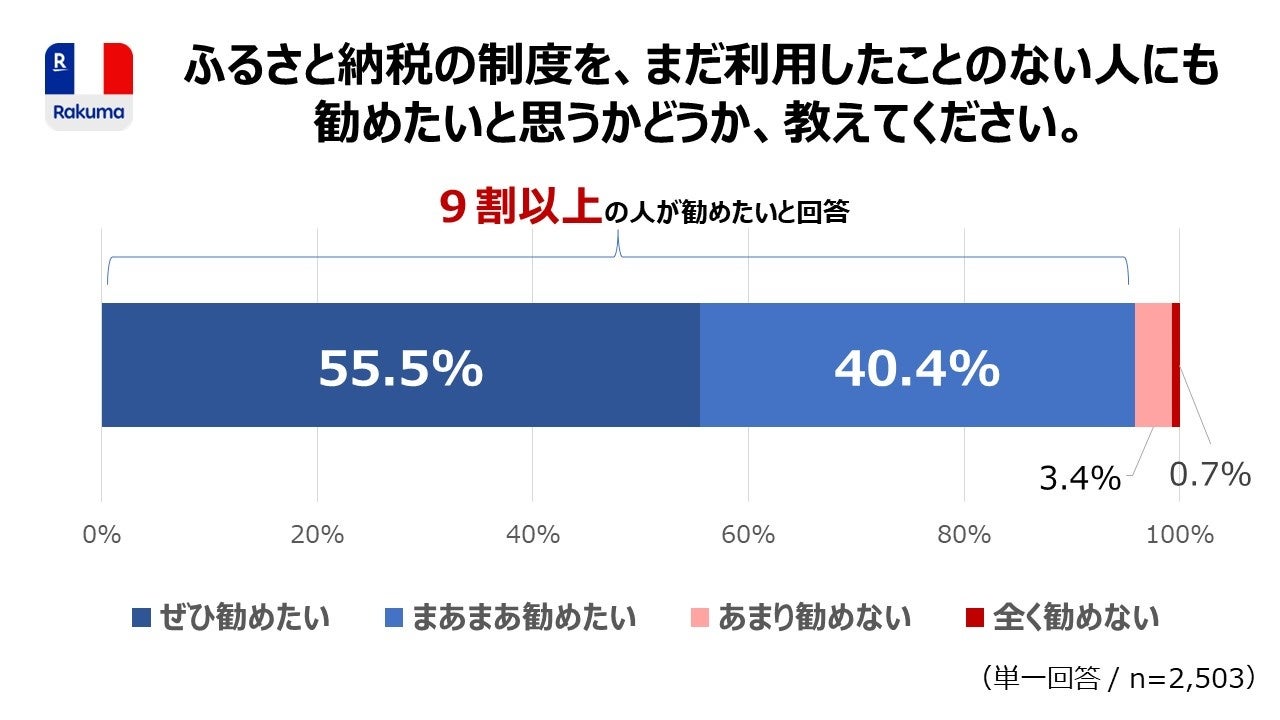 ふるさと納税の利用者2,503人に「ふるさと納税の制度を、まだ利用したことのない人にも勧めたいと思うかどうか」と質問したところ、1位「ぜひ勧めたい」(55.5%)、2位「まあまあ勧めたい」(40.4%)となり、合わせて95.9%の人がポジティブな回答を選びました。