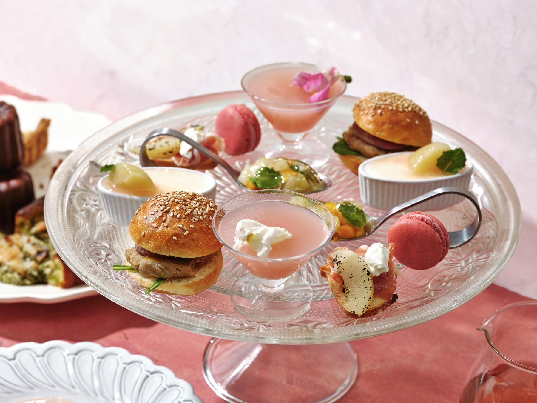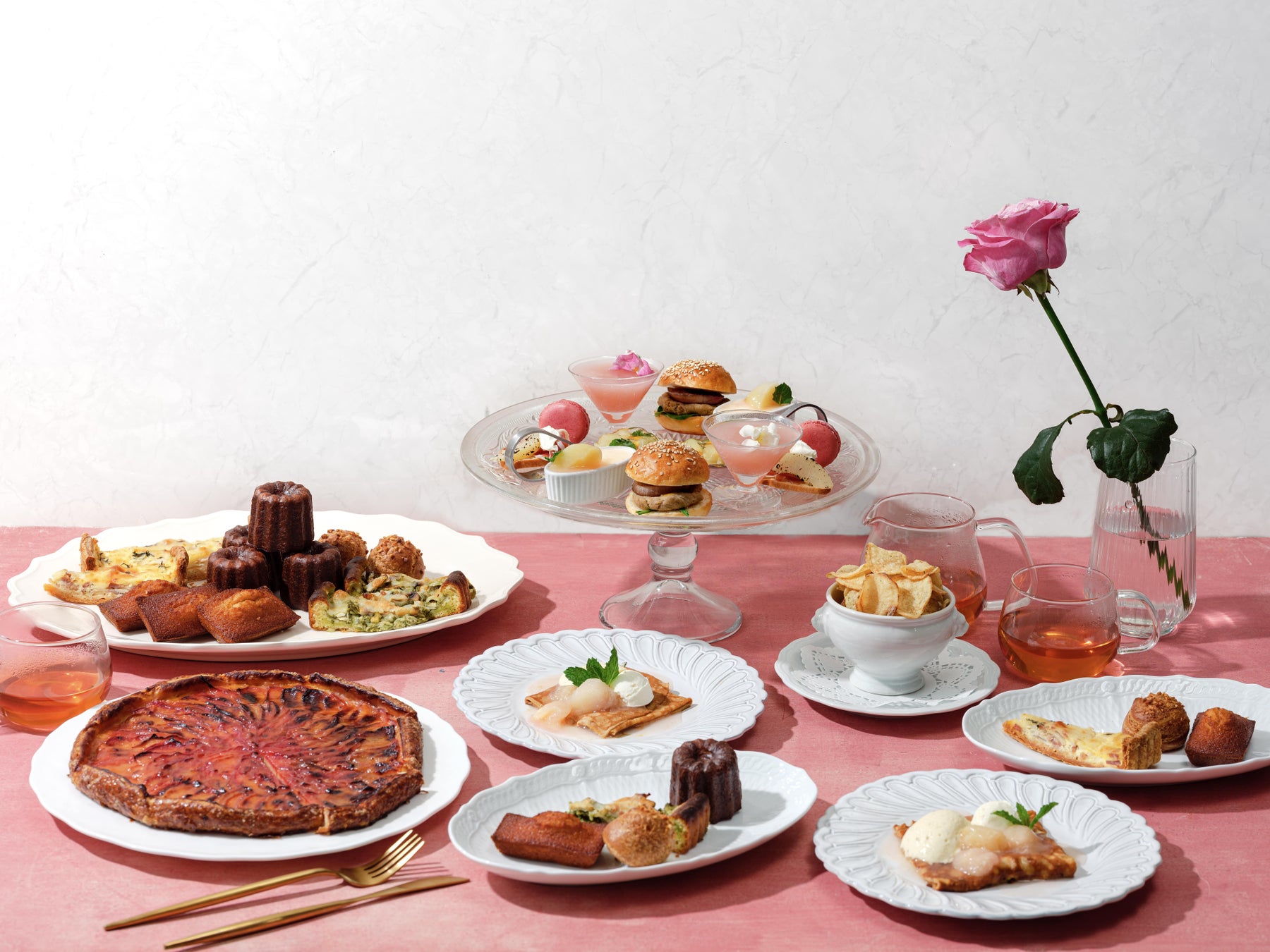旗艦店のRITUEL 虎ノ門店で提供する『桃のアフタヌーンティー』は、Seasonal Premier Plate/プルミエプレート(季節の一皿)に、アールグレイでマリネした“桃と生ハム マスカルポーネのカナッペ“、”鴨コンフィバーガー“、桃とローズマリーの香りが豊かな”桃とローズマリーのglassスープ“、桃とマンゴーをマリネした自家製の“桃とマンゴーのゼリー”、濃厚なレアチーズケーキと桃のコンフィチュールが相性抜群の”ピーチレアチーズケーキ“、”ラズベリーマカロン”をご用意。お客様の目の前までお運びするBake Wagon/ベイクワゴンは、“カヌレ“、”シューパリジャン“、ネクタリンを甘酸っぱくマリネしガレットとして焼き上げた”季節のフルーツのガレット(ネクタリン)“、”フィナンシェレーヌ“、”スコーン“、”キッシュロレーヌ“、チキンジェノベーゼのブリオッシュタルト”の7種類の中からお好みの焼菓子(キッシュ含む)を4種類その場でお選びいただけます。 Main Dessert/メインデザートには、全粒粉をたっぷり使用したクレープをオレンジと桃のソースで煮込んだシュゼットに、フレッシュな桃とチーズババロアが軽い味わいの”桃とアールグレイババロアのシュゼット”です。また、お口直しには、Side/サイドのポテトチップスをご用意しています。ドリンクは、ハーブティー含む10種類ほどの豊富なラインナップを取り揃え、時間内でおかわり自由となっています。