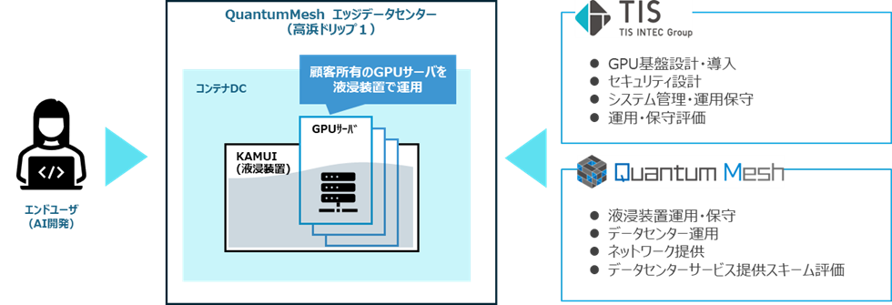 エンタープライズ向けの豊富な開発・運用実績と国内最大級のデータセンター網を持つTISおよび分散型エッジデータセンター・液浸冷却システムに関する高い技術力を持つQuantum Meshは、双方の強みを活かし、GPUサーバー需要の増大やデータセンターの高負荷化・電力コスト高騰といった課題に対応するAI基盤サービスを共同で展開します。2025年11月頃から、液浸冷却システム「KAMUI」のファーストユーザーとなる企業とともに、液浸冷却システムの運用や追加開発機能などの検証を目的としたPoCを実施します。その成果を踏まえ、2026年夏頃より両社のデータセンターをハイブリッドで活用し、社内データを活用したAIモデル構築や業界・業務特化型LLM構築といった幅広いニーズに対応可能なAI基盤サービスの提供開始を目指します。