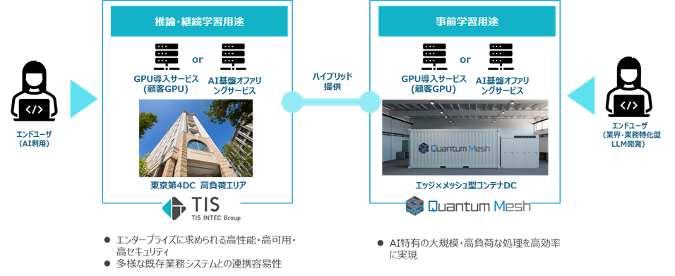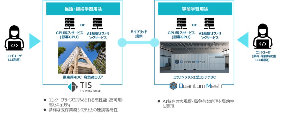 AIを活用したサービスを展開する事業者や社内でのAI活用を検討する事業者、業界・業務特化型AI研究に取り組む事業者向けに、業務効率化や事業展開を支援する高い効率性や利便性を持ったAI基盤サービスの開発を予定しています。また、AIエージェント時代を見据え、セキュアなプライベートAI学習ニーズに対応するため、企業ごとの用途に応じてTISの東京第4データセンターとQuantum Meshの分散型エッジデータセンターをハイブリッドで活用できる体制の構築を目指します。