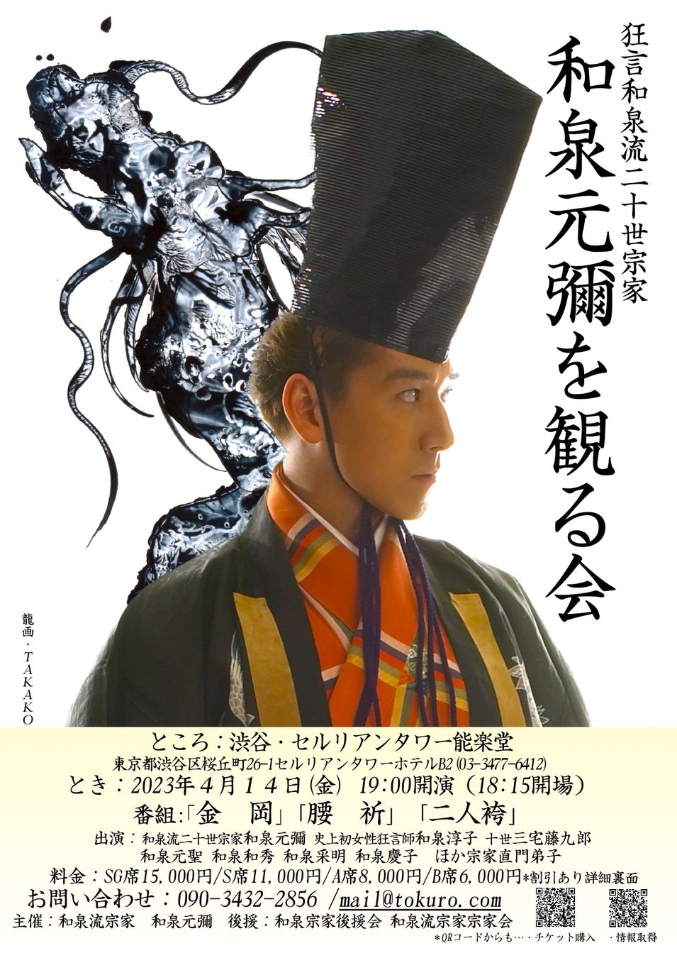 狂言 和泉流宗家主催、『和泉流二十世宗家和泉元彌を観る会』が2023年4月14日(金)にセルリアンタワー能楽堂(東京都渋谷区桜丘町26-1 セルリアンタワー地下2階)にて上演されます。