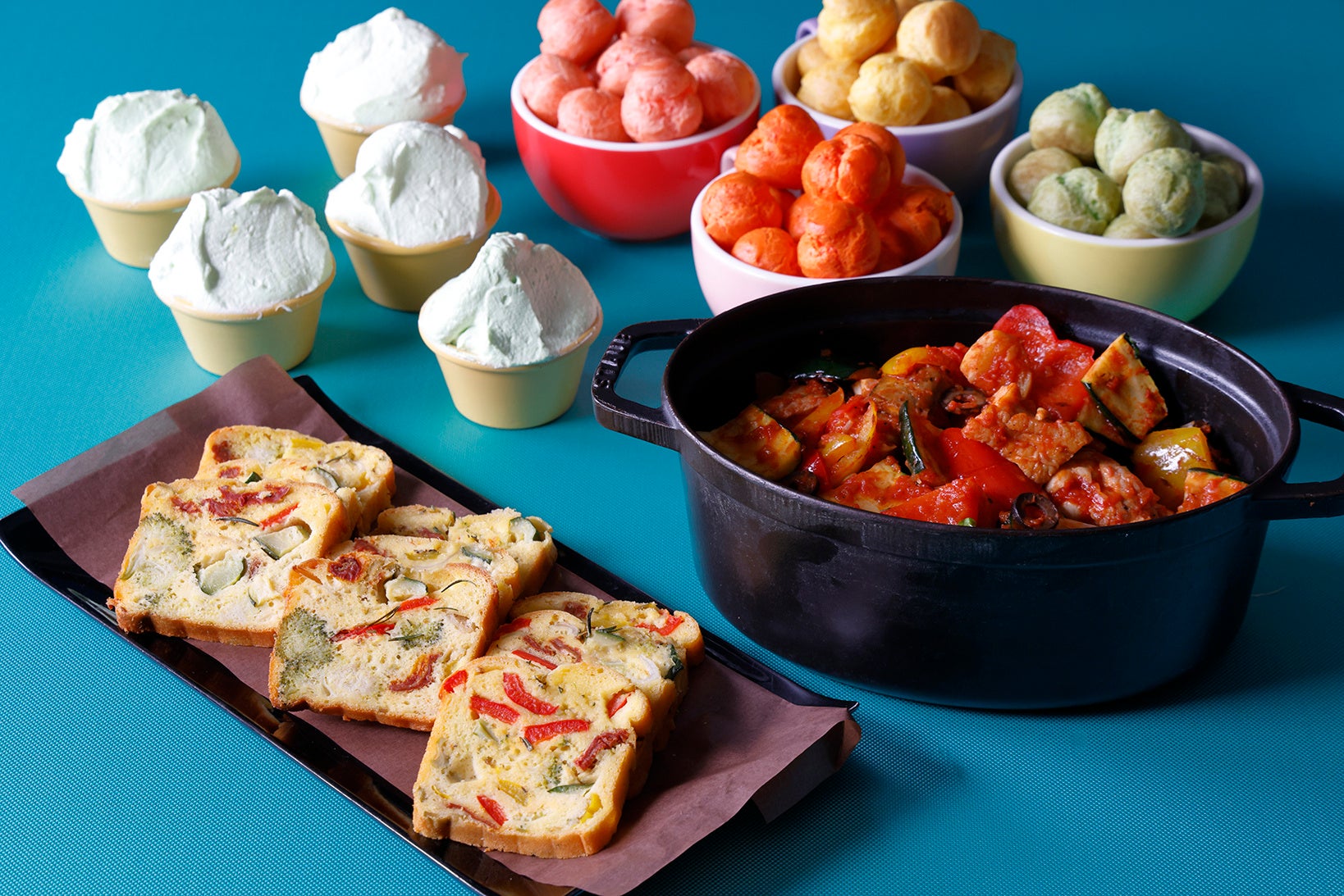 ミックスベジタブルと桜エビのケーク・サレ/イタリア産グリル野菜とチキンの軽い煮込み ブラックオリーブ風味/枝豆とバニラジェラート/ベジタブルプティシュー4種(トマト&いちご、にんじん&オレンジ、かぼちゃ&チョコレート、ほうれん草&ピスタチオ)