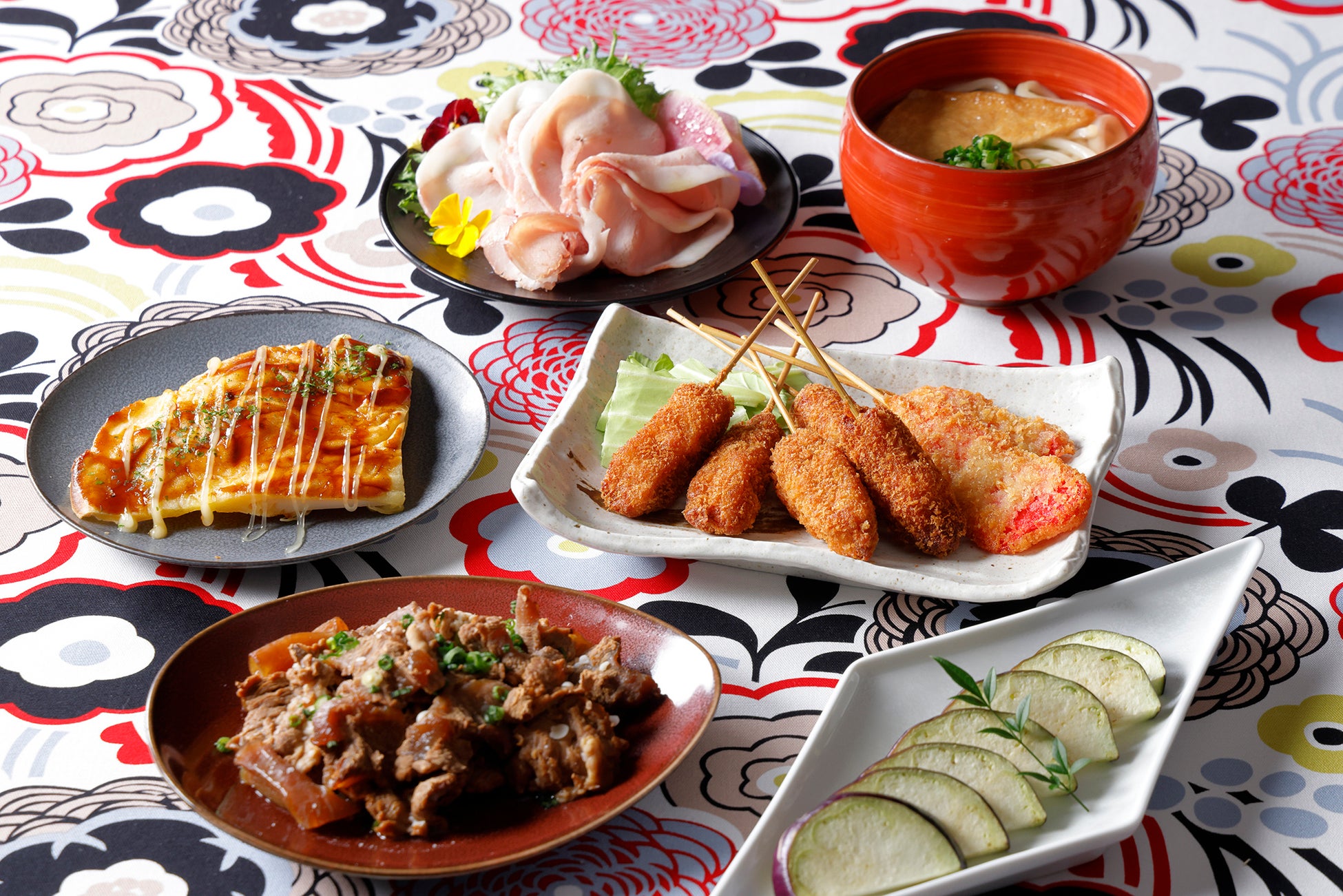 泉州水なすの浅漬け/ボンレスハム(タケダハム)/どて焼き/いか焼き/串カツ/きつねうどん