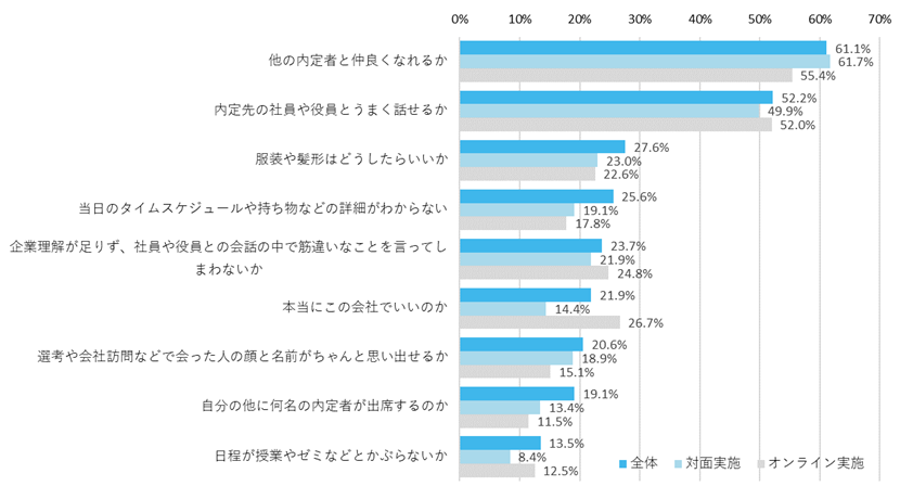 内々定を得た学生に、内定式に向けて不安なことや気がかりなことがあるか聞いたところ、最も多かったのは「他の内定者と仲良くなれるか」(61.1%)だった。次いで「内定先の社員や役員とうまく話せるか」(52.2%)で、内定式当日の内定者同士や社員とのコミュニケーションに不安を感じる学生が多いようだ。そのほか「服装や髪形はどうしたらいいか」(27.6%)や「当日のタイムスケジュールや持ち物などの詳細がわからない」(25.6%)、「自分の他に何名の内定者が出席するのか」(19.1%)など、当日の様子を具体的にイメージして臨みたいという心情がうかがえる。【図6】