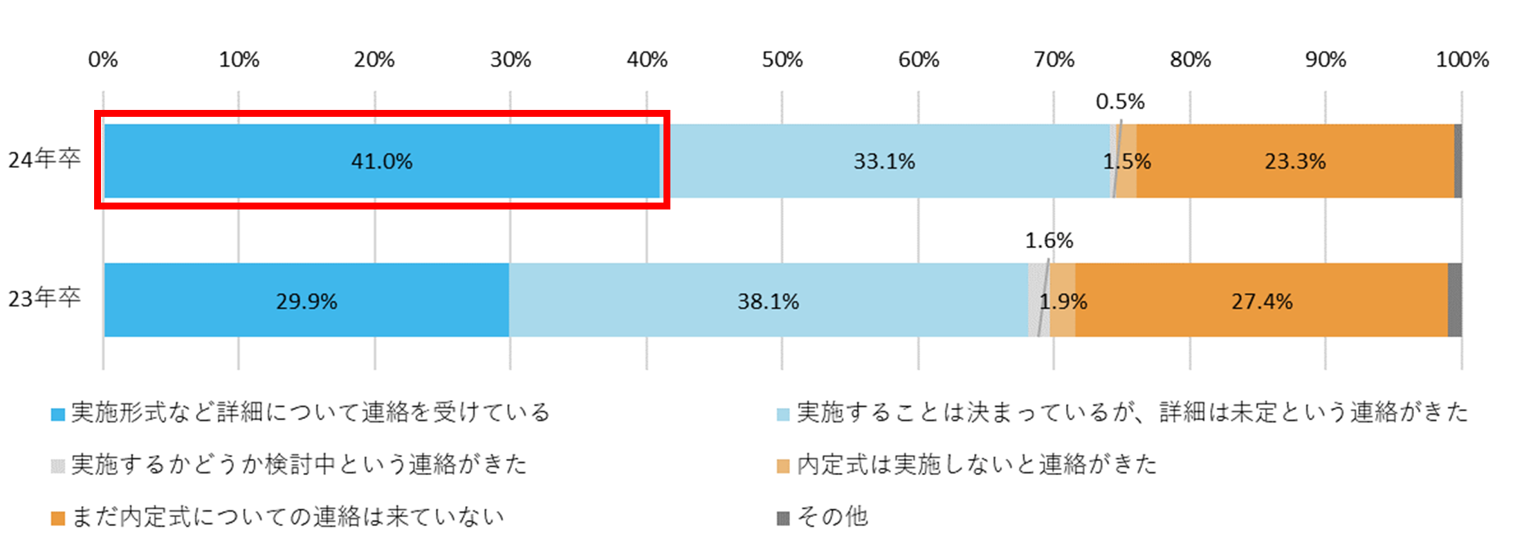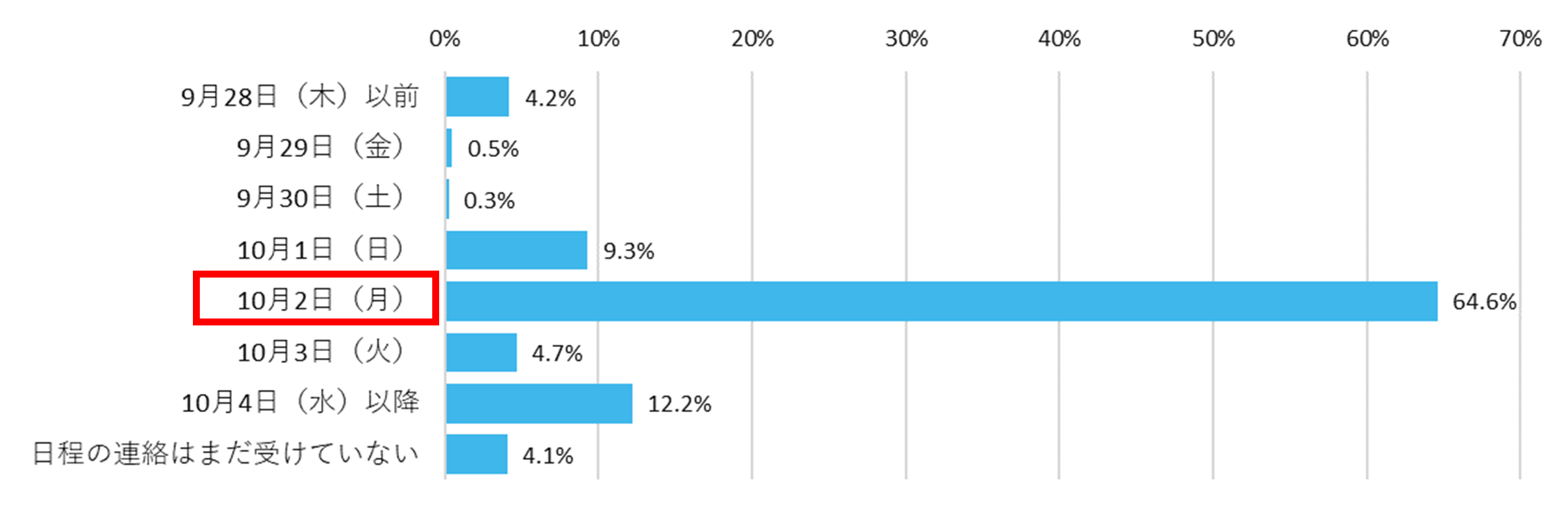 内々定を得た学生に8月末時点で入社予定先の企業から内定式に関する連絡を受けたかを聞いたところ、「実施形式など詳細について連絡を受けている」が前年比11.1pt増の41.0%で、実施形式は「対面形式で実施される予定」が84.5%で前年よりも18.4pt増えた。2022年卒調査ではコロナ禍の影響が残り「オンライン形式」の回答が多かったが、前年2023年卒調査で「対面形式」が増え逆転した。オンライン形式での実施も12.2%だが、対面形式での実施が増加傾向となっている。また、日程については10月2日(月)予定との回答が64.6%で最多だった。【図3、4、5】