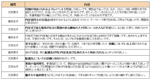 内定式について学生が抱える不安や気がかり、希望することを調査しましたが、内定者同士や先輩社員とのコミュニケーションへの不安のほかに、福利厚生や配属先など説明会や選考では詳しく聞けなかった情報を改めて確認したいという希望も見られました。