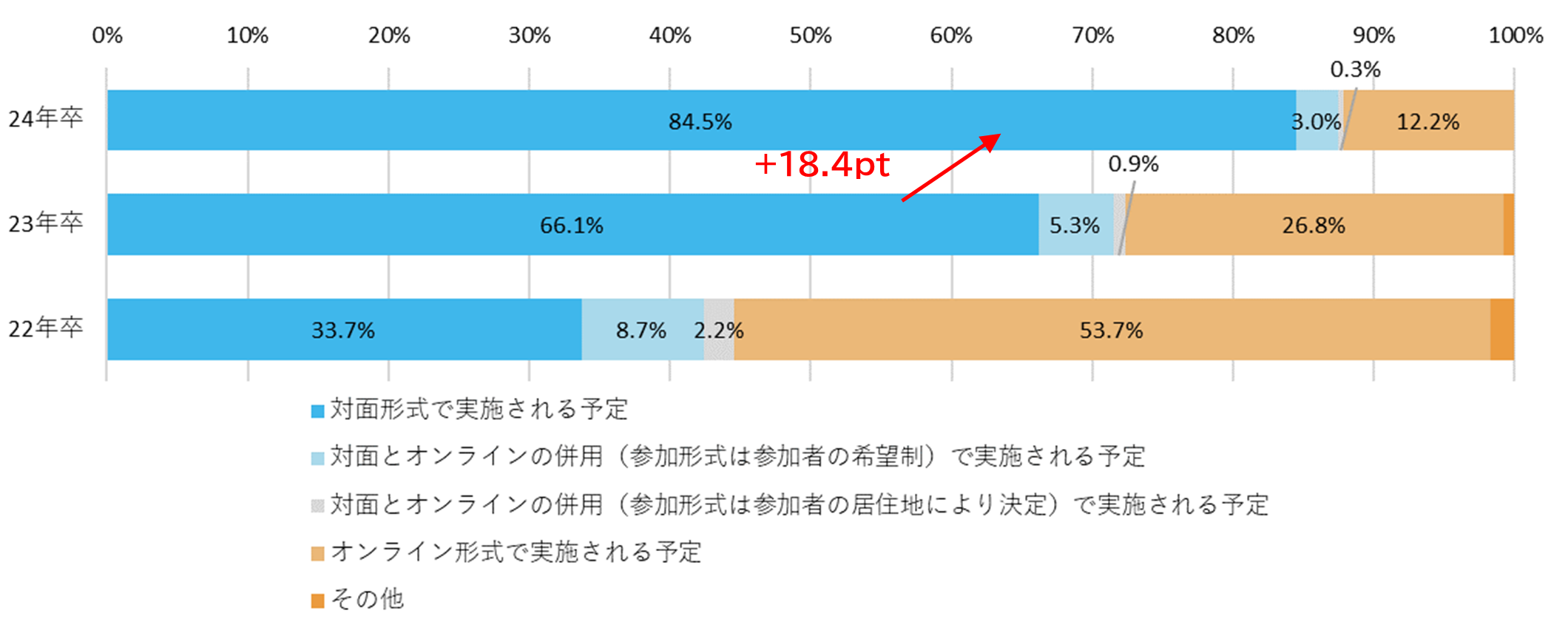 内定式の実施形式は「対面」が84.5%で前年より18.4pt増加。内定式は「他の内定者と仲良くなれるか」「社員とうまく話せるか」など、当日のコミュニケーションに不安。
