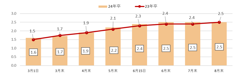 2024年卒業予定の大学生・大学院生の8月末時点での内々定率は前月比2.0pt増の83.9%、平均内々定保有社数は前月同値の2.5 社だった。7月同様、内々定率・平均内々定保有社数ともに高い割合で推移している。【図1、2】