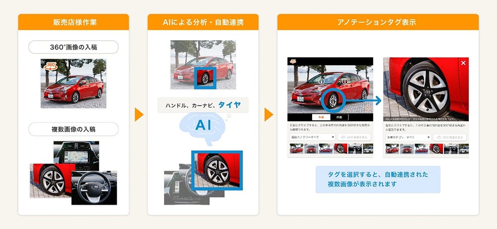 『カーセンサー』の「アノテーション機能」では、画像カテゴリ判別AIの技術を用いることで、360°画像と複数の詳細画像を自動連携。360°画像を軸に、タイヤやライト、ハンドルといった気になる箇所の詳細画像がタグをクリックするだけで表示されるようになります。販売店にとっては、従来通りの入稿で、物件詳細画像と360°画像が自動連携されるため、追加の作業がなく物件の魅力を訴求できるようになります。事前検証店舗では問い合わせ率が110%改善しており成約率の向上も期待できます。