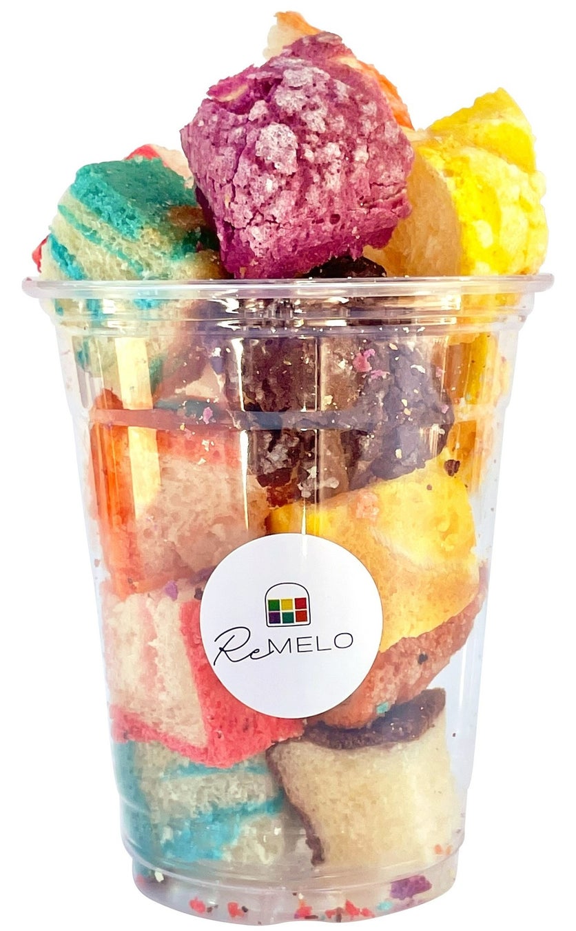 カラフルなキューブ型のメロンパン。会場では一口サイズを詰めたカップも映えるスイーツ。
