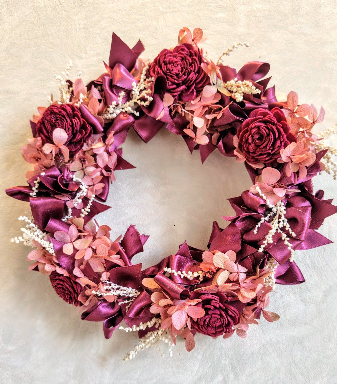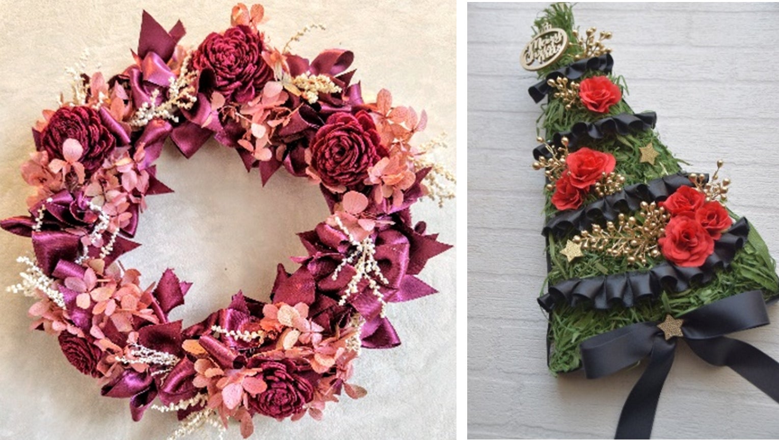 プリザーブドフラワーとソラフラワーを使用し、華やかなクリスマスリースを作ります。色はワインレッドとシャンパンゴールドの印象の異なる2色からお選びいただけ、飾る場所や雰囲気に合わせて素敵なクリスマスを演出します。