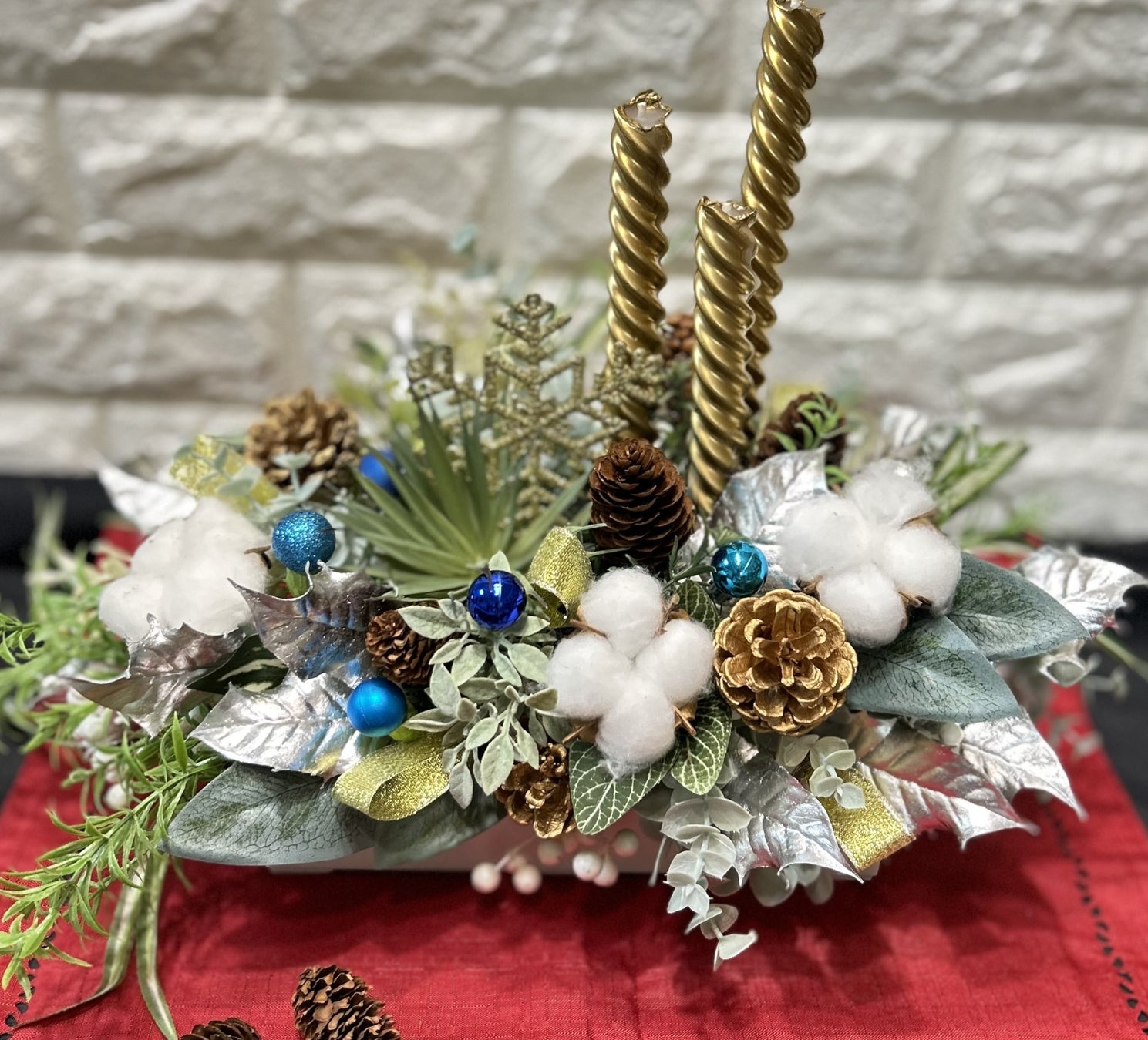 3本のゴールドキャンドルの温かい光に、フェイクグリーンや松ぼっくりでクリスマスシーズンの森の雰囲気を表現。ブルーのオーナメントが冬の澄んだ夜空をイメージさせる、クリスマスにぴったりのアレンジメントです。自然素材を使いながらも、華やかで上品に仕上げます。