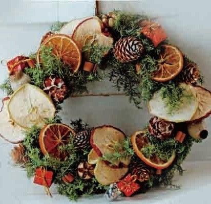 生の針葉樹とドライフルーツを使ったフルーティークリスマスリース