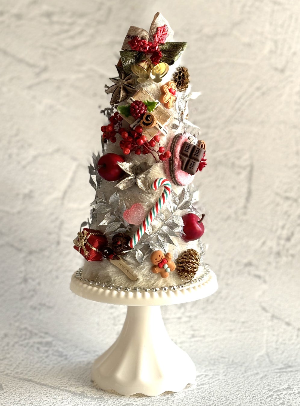 まるでケーキをのせるようなホワイトカラーのスタンドに、同じくホワイトカラーのフェザーでツリーの土台を作成し、可愛らしいフェイクスイーツやリボンを自由に飾り付けて仕上げます。クリスマスパーティーなど、テーブルを彩るアクセントにおすすめです。