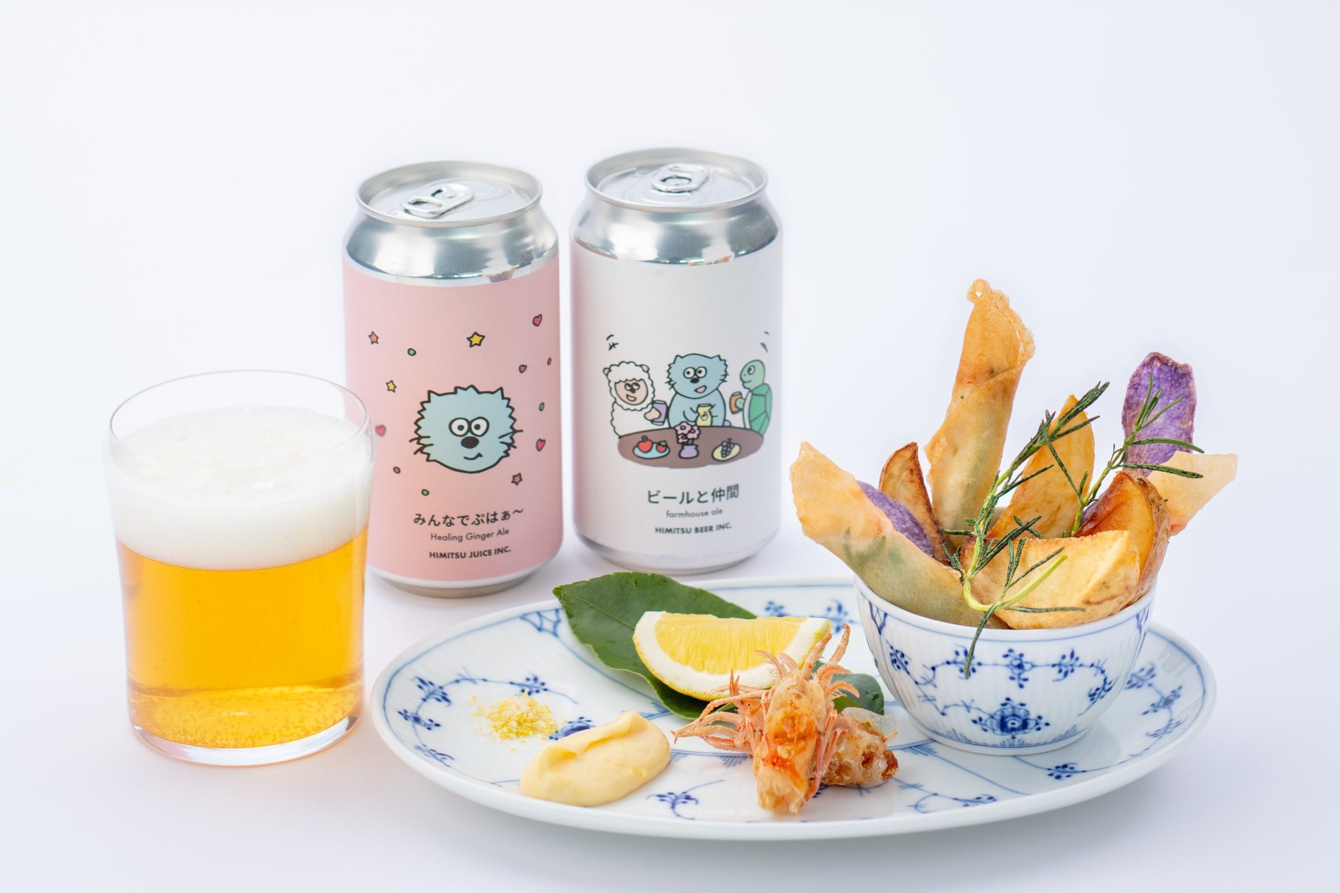こだわりの素材が豊かに感じられるひみつビール。自社栽培の八朔や夏みかん、ハーブを使った爽やかな味わいをセレクトします。ビール文化が盛んなベルギーの郷土料理「ムール・フリット」を車海老のアレンジで。