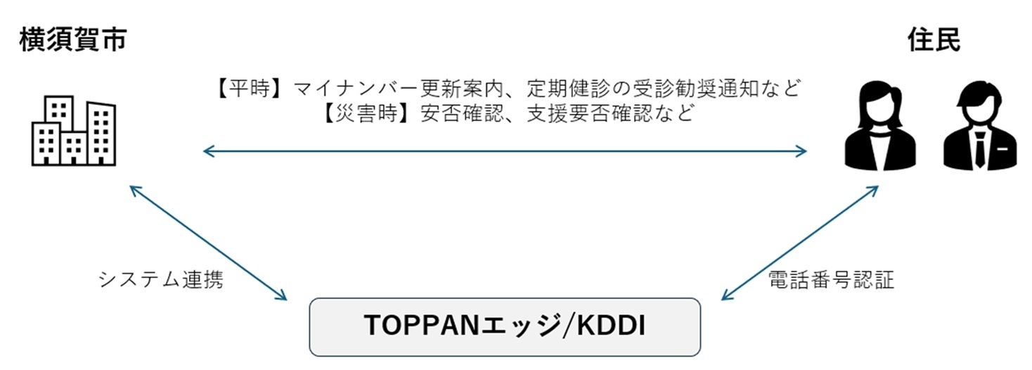 本実証では、KDDIが提供する電話番号認証技術「Number Verification」(注1)を、TOPPANエッジが提供するRCS(注2)を活用したメッセージ配信サービスや公的個人認証サービス(JPKI)に組み込み、横須賀市民向けに提供することで、行政と住民とのコミュニケーションにおける有効性を検証します。マイナンバーカード更新の案内や定期健診の受診勧奨通知など、行政通知のデジタル化に電話番号認証技術「Number Verification」を活用することで、オンラインにおけるなりすましや不正利用のリスクという行政課題の解決が期待できます。