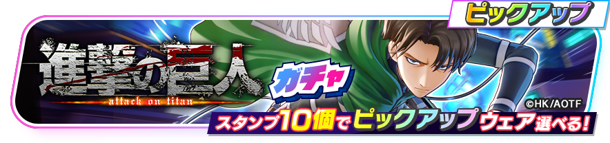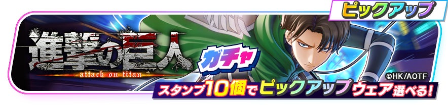 第1弾コラボで登場したリヴァイ(CV:神谷浩史)や赤髪のヒーロー(CV:梶裕貴)、ラプラス(CV:鬼頭明里)のバトルウェアがピックアップで再登場します。また、ウェポンチップやヒーロー専用アクセサリーも再登場いたします。本ガチャは、「進撃の巨人第2弾ガチャチケット」でもご利用いただけます。