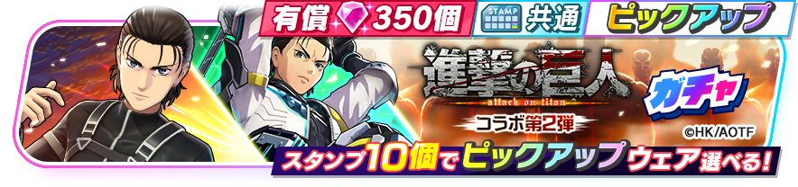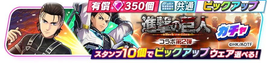 エレン(CV:梶裕貴)の2種類のバトルウェアがピックアップで登場し、ウェポンチップやヒーロー専用アクセサリーも登場いたします。また、1日1回無料でまわせるほか、10連ガチャを2回まで有償ジュエル350個でまわすことができます。