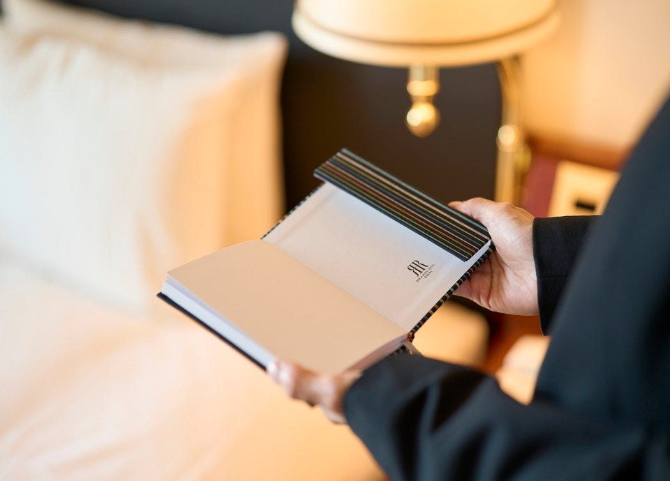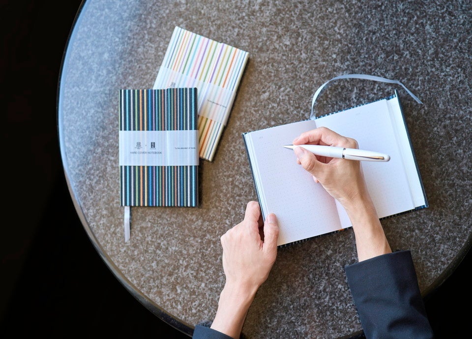 特典のノートは、ホテルロゴがあしらわれたオリジナルデザインで、小倉織の特長であるたて縞の洗練されたデザインと、木綿の艶やかでマットな質感が魅力です。さらに、マグネットで優しく開閉できる頑丈なカバーと実用性を兼ね備えており、旅の記録や日々の思い出を刻むツールとして、ビジネスやプライベートを問わず、あらゆる場面でお使いいただけるドット方眼です。