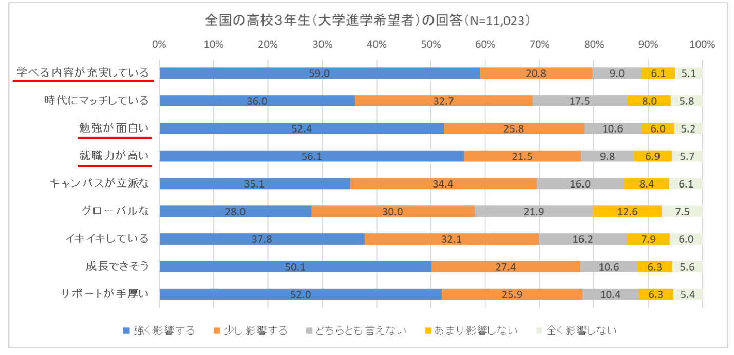志望校の検討に「強く影響する」イメージ項目について聞いたところ、最も強く影響したのは「学べる内容が充実している」で、「就職力が高い」「勉強が面白い」が続いた。【図3】